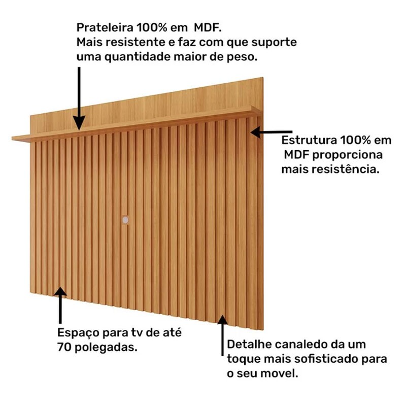 O Painel Speed Trend complementa o conjunto com um visual contemporâneo e elegante. Produzido também 100% em MDF, ele possui detalhe ripado e prateleira robusta para objetos decorativos. O passa-cabos embutido ajuda a manter a organização, enquanto o espaço é ideal para TVs de até 70 polegadas.