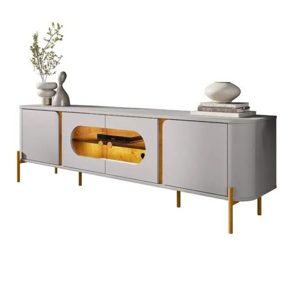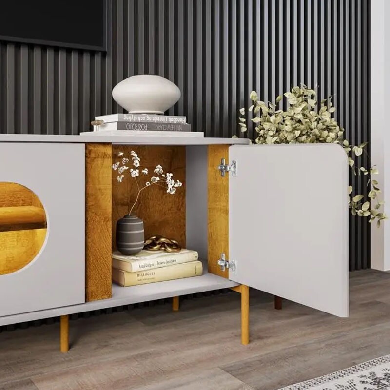 Sua estrutura em MDP 15mm garante resistência e durabilidade, enquanto as 04 portas em MDF com dobradiças metálicas soft close proporcionam um fechamento suave e silencioso. Os 04 nichos internos são ideais para organizar eletrônicos e objetos decorativos, mantendo o ambiente sempre em ordem.