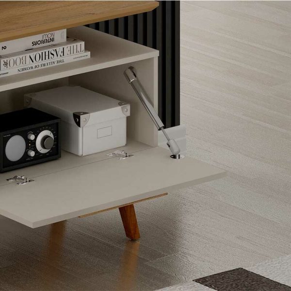 Sua estrutura em MDP/MDF garante resistência e durabilidade. Possui 03 portas basculantes com dobradiças metálicas de pressão, ideais para guardar objetos e manter tudo sempre organizado. Os nichos laterais e centrais são perfeitos para acomodar eletrônicos e itens decorativos, enquanto o puxador em MDF envelopado acrescenta um toque refinado ao visual.